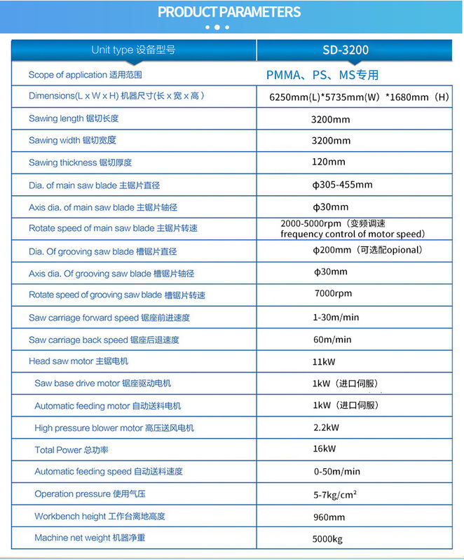 7. Η ράγα οδηγού της έδρας του πριονιού υιοθετεί εισαγόμενη μάρκα, η ευθύτητα πριονίσματος< 0,06mm, με υψηλή ακρίβεια και μεγάλο φορτίο, ο έλεγχος σερβο Panasonic χρησιμοποιείται ειδικά για PMMA, MS, PS, PLEXIGLASS, ACRYLIC, PLASTIC.
