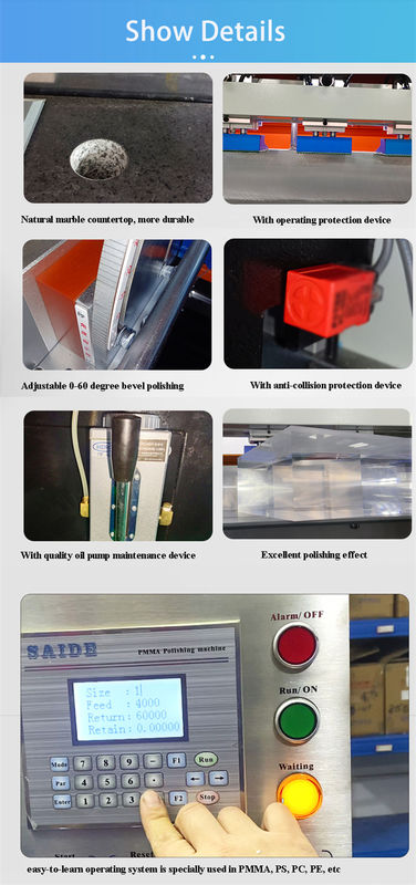 Η SAIDE προσφέρει υπηρεσίες προσαρμογής για τη μηχανή λοξοτμήσεων άκρων SD-G1000 , επίσης γνωστή ως μηχανή αφαίρεσης γρεζιών ακρυλικών άκρων, εξοπλισμός λοξοτμήσεων ακρυλικών άκρων και εξοπλισμός αφαίρεσης γρεζιών ακρυλικών άκρων. Τα μηχανήματά μας κατασκευάζονται στην Guangdong της Κίνας και διαθέτουν πιστοποίηση CE.